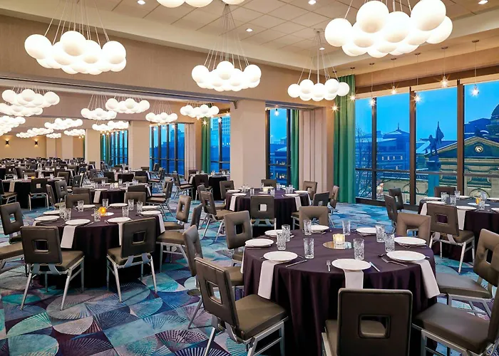 This South Bend hotel is right near the Sprawling 3 - story Studebaker National Automobile Museum.